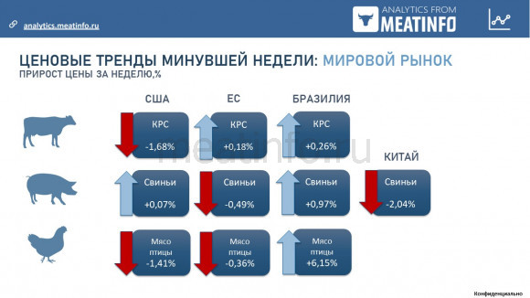 Цены на курятину в Бразилии растут, что обусловлено как внутренним спросом, так и экспортом в начале месяца. Внезапный скачок цены на 6,2% за одну неделю — это очень сильное движение. Поддержку ценам оказало и признание Бразилии страной, свободной от птичьего гриппа, что привело к усилению экспортного спроса.