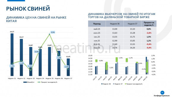 По итогам торгов на Даляньской бирже на минувшей неделе средняя стоимость фьючерсов на свиней падала. На 37-й неделе 2025 года цены на свиней в Китае продолжили снижение. Рынок свиней в Китае находится в фазе коррекции после бума, вызванного восстановлением после АЧС. Низкие цены являются закономерной реакцией на возросшее предложение и сезонно ослабленный спрос. Эта ситуация усугубляет положение глобального рынка свинины, и быстрого восстановления цен ждать не стоит.