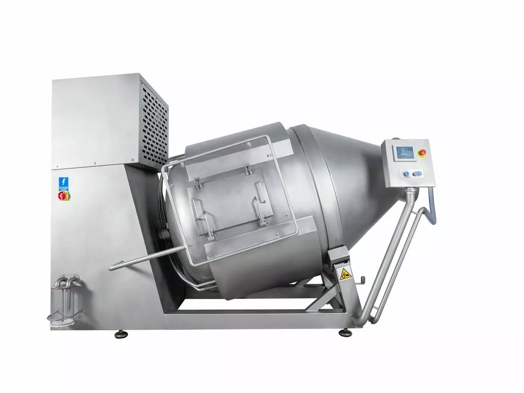 Вакуумный массажер оснащен наклонным барабаном с несколькими спиральными массирующими лопастями, обеспечивающими равномерное распределение продукта и маринада во время работы. Микропроцессорное управление позволяет гибко настраивать параметры, включая скорость вращения барабана, время массирования, паузы и уровень вакуума, что обеспечивает высокое качество обработки разного сырья. Корпус и внутренние детали выполнены из пищевой нержавеющей стали для максимальной гигиеничности и долговечности.